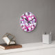 Diese Wanduhr ist ein modernes Design aus schiefen Rechtecken mit weißen Löchern in Rosa- und lila Farbtönen.