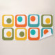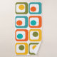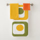 Dieses Set ist mit einem orangefarbenen Waschlappen, einem gelben Handtuch und einem Badehandtuch ausgestattet, das Mitte des Jahrhunderts in vier Reihen abgerundete Rechtecke mit Ovalen, Gelb, Grün und Türkis aufweist.