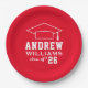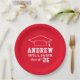 Die Teller für Rundpapier-Abschlüsse sind in Rot und Weiß (können über "Anpassen!" geändert werden) mit einem Graduierungsdeckel und einem benutzerdefinierten Text für den Namen und das Klassenzjahr des Absolventen ausgestattet.