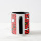 Diese Tasse ist mit einem modernen Muster von fett roten Mohnblüten mit gelben und schwarzen Mittelpunkten auf weißem Hintergrund ausgestattet.