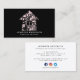 Moderne, rosa und schwarze Visitenkarte für kommerzielle oder wohnliche Reinigungsdienste, Hausbesitzer, Zimmermädchen oder Hausmädchen. Design mit rosafarbenen Haussymbolen und Innenausstattung. Passen Sie die Vorderseite mit zwei Zeilen benutzerdefiniertem Text auf einem schwarzen Hintergrund an, und fügen Sie Ihre vollständigen Kontaktdaten zur Rückseite und zu den sozialen Medien Details. Modernes, elegantes modernes Design.