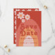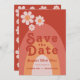 Kühne moderne Groovy Retro 70er Orange Hochzeit speichern Sie das Datum Einladung. Cooles Retro-minimalistisches Muster mit Regenbogenbogen-Design in apricot terracotta orange und pfirsichfarben. Diese lustige Hippy-Save the Date-Karte lässt sich einfach mit den einfachen Vorlagen personalisieren. Ideal, um den Ton für eine Sommerfrühlings- oder Herbsthochzeit zu setzen. Original-Kunstwerk von Catherine Sweetman