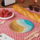 Ein wunderschönes 70er Jahre inspiriertes, farbenfrohes Retro Regenbogen abstrakte Wellen Design. Eine minimalistische Hochzeitsplatte mit groben Mustern und Retro-Farbpalette. Auch die passenden Hochzeitseinladungen und andere Schreibwaren sind verfügbar.