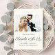 Moderne helle Creme-Entwicklung oder private Hochzeitsankündigung und Empfang Save the Date mit Ihrem Foto in einem "Mr. & Mrs." Rahmen, "Celebrate With Uns" in einem schicken Drehbuch und Ihren Namen, Empfang und Ort in einfacher Typografie. Auf der Rückseite, personalisieren Sie Ihre Ankündigung und fügen Sie Ihre Namen in einem signaturähnlichen Skript.