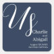 Diese eleganten, romantischen Hochzeitsaufkleber sind marineblau gehalten. Der Titel "Uns" wird in einem großen Script-Schriftart an der Spitze gedruckt, oberhalb der Namen der Ehepaare, die heiraten. Die Hochzeitsinformation wird unten in einem raffinierten, modernen, weißen Schriftart gedruckt.