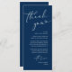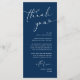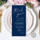 Mit dieser eleganten Dankeschön-Karte, die für jeden Gast im Rahmen des Abendessens entworfen wurde, machen Sie Ihren Hochzeitsempfang besonders. Mit einem modernen minimalistischen Layout mit schicken Schriftzeichen, dem Thema Navy Blue, ist es eine durchdachte Möglichkeit, der Familie und Freunden zu danken, dass sie ihren großen Tag gemeinsam mit Ihnen verbracht haben. Ideal für Hochzeitsessen, Probe-Dinner oder Empfänge, kann diese individuell gestaltbare Karte mit Ihren Namen, Datum und besonderen Nachrichten personalisiert werden. Ein stilvolles Detail, das sich in Form eines Hochzeitstisches präsentiert und den Gästen ein herzliches Ambiente verleiht, um sich an den Abend zu erinnern. Ideal für moderne, rustikale oder klassische Hochzeitsthemen.