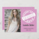 Dieses gürttlich moderne Foto Graduierungsparty lädt Design ein weißer Kreis als eine Briefmarke mit weißer Typografie, die "Klasse von" und den Abschluss Jahr. Rosa Hintergrundfarbe und weißer und grauer Text. Fügen Sie einfach das Foto, den Namen und das Jahr des Abschlusses des Absolventen hinzu. Füllen Sie alle Party-Informationen auf der Kartenrückseite aus. Ein tolles Design für eine High School oder Uni-Abschluss Party Einladung. Andere Hintergrundfarben sind auch in unserem Shop erhältlich.
