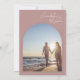 Moderne rosafarbene Arche Erstaufenthalt Foto Hochzeit Einladung. Stilvoll beeindrucken Sie Ihre Hochzeitsgäste mit dieser modernen Goldhochzeit-Einladung der Rose mit einem stilvollen Foto-Bogen auf der Vorderseite, das Sie mit dem von Ihnen gewünschten Foto der Hochzeit personalisieren können, und wunderschönen weißen Schriftzeichen über einem größeren Foto des Ehepaares, auf der Rückseite der Hochzeitseinladung. Diese Einladung verleiht einem eleganten, minimalistischen Ambiente das perfekte Ambiente für jede moderne, minimalistische Hochzeit. Die schöne und elegante Gestaltung erinnert an den stilechten Foto-Bogen, der sich auf der Rückseite der Einladung wiederholt, begleitet von den eleganten Initialen des Ehepaares. Diese Einladung wird den Ton für eine moderne, elegante, rosafarbene Hochzeitsdekoration in Rose-Gold und passende weiße oder neutrale Blume Set. Eine perfekte Ergänzung zu jeder modernen, minimalen Hochzeitsfeier. Das Sonntagkollektiv © von Rachel Hannah Gee