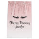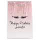 Ein modernes, trendiges (Imitate) glänzendes Design auf einer Geburtstagsgeschenktüte. Für diejenigen, die ein Gefühl von Klasse und Eleganz vermitteln wollen. Entworfen mit einem Hintergrund, der ein Bild von glitzernden, rosa Glitzer-Tropfen hat. Die Erholung des Hintergrunds ist ein zarter pastellrosa Farbverlauf. Eine Abbildung eines Paares schwarzer Wimpern komplettiert das Design.