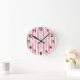 Diese Wanduhr hat ein modernes Design von rosa und lavender abgerundeten Rechtecken in steigender und abnehmender Größe, die vertikal auf einem weißen Feld laufen.