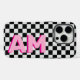 Modern Pink Shadow Mit Monogramm Personalisierter vertikaler Big-Initial-Checkerboard iPhone 16 Pro Case - Dieses trendy schwarz-weiß karierte Gehäuse hat große rosa vertikale Schattenmonogramm auf der Seite, die Sie anpassen können, um dieses Handy Gehäuse zu einer Art von.