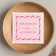 Fügen Sie Ihre Hochzeitsempfehlung, Ihr Abendessen in der Probe, Ihre Verlobungsfeier oder Ihren Polterabend mit diesen modernen Hochzeitsnapkins in Rosa und Rotem Rahmen hinzu. Die Retro-Hochzeitsnapkins zeigen die Namen des Paares in fett roter Schrift, umgeben von einem roten, wellenförmigen Rahmen, der mit einem rosa Hintergrund kontrastiert. Die trendigen Hochzeitsnapkins wurden entworfen, um sich mit unserer Hochzeitskollektion "Modern Wavy Frame" abzustimmen.