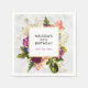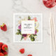 Papierservietten aus Party mit hübschem Design. Eine Blumenstruktur mit vielen verschiedenen Blume in Rot-, Rosa- und Weißtönen und viel grünem Blattwerk. Ein überlagerter Rahmen mit einem Imitat-vergoldeten Rahmen. Elegantes Design. Hintergrund aus weißem Marmor.