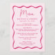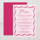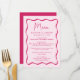 Fügen Sie Ihrer Verlobungsfeier, dem Probe-Dinner oder dem Hochzeitsempfang eine Vintage Touch mit diesem Modern Pink Wavy Frame Hochzeitsmenü hinzu. Das Design zeigt die Namen der Paare, das Hochzeitdatum und die Menüoptionen in fett rosa Schrift, umgeben von einem dunkelrosa, gewellten Rahmen mit einem hellrosa Hintergrund. Das Retro-Hochzeitsmenü koordiniert mit unserer Hochzeitskollektion Moderner Rahmen.