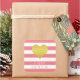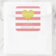 Happy Birthday Aufkleber mit einem Imitat goldenen Folie Herz auf einem rosa und weiß gestreiften Muster. Matching-Wohngestaltung verfügbar.