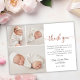 Einfache moderne Elegante Rose Gold Script Neugeborene 3 Foto Collage Baby Girl Danke Karte. Enthält einen wunderschönen "Dankeschön"-Text in einem kursiv handgeschriebenen Kalligraphie-Swash-Schwanz-Schriftart-Skript in Imitaten Rose Goldfolie (oder rot-rosa Folie) und vorgefertigte persönliche Nachricht. 3 Foto vorne und hinten (1) ein vollflächiges Baby-Foto. Einfach mit Ihrem Baby Foto und Details personalisieren.