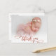 Elegante moderne Kalligraphie Rose Gold Script Neugeborenen Baby Foto Vielen Dank Postcard. In einem handgeschriebenen Kalligraphie-Swash-Schwanz-Schriftart in IMITATEN mit rosa Rosengold-Folie steht ein wunderschöner "Dankeschön"-Text. Auf der Rückseite vorgefertigte persönliche Nachricht in Schwarz-Weiß. Einfach mit Ihrem Baby Foto und Details personalisieren.
