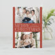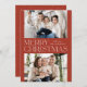Moderne Weihnachtskarte mit "Frohe Weihnachten", die im Zentrum des Designs in trendiger weißer Schrift mit Rosthintergrund ausgestellt ist. Personalisieren Sie die einfache Weihnachtskarte mit Ihrem Familiennamen und 2 horizontalen Fotos. Die Karte kehrt um, um einen Rosthintergrund mit subtilen weißen Punkten (Schnee) anzuzeigen.