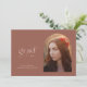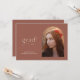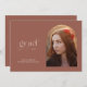 Diese moderne Abschluss-Ankündigung besticht durch eine trendige Typografie und ein bogenförmiges Foto. Auf der Vorderseite ist das Wort "grad" in einzigartiger Schrift mit dem Abschluss Jahr unten geschrieben. Fügen Sie unten den Namen und die Schule des Absolventen hinzu. Die Typografie ist hellrosa vor einem verblassten roten Rosthintergrund. Rechts neben der Typografie wird ein bogenförmiges Foto angezeigt. Auf der Rückseite ist eine Vorlage für die Details der Graduierungspartei.