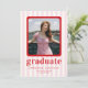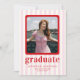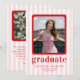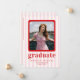 Feiern Sie stilvoll mit unserer schicken und modernen Abschluss-Ankündigungskarte. Dieses Design mit spielerischen rosa und weißen Streifen als Hintergrund ist mit fett roten Texten geschmückt und bietet einen lebendigen und zeitgenössischen Flair. Es ist perfekt auf die Präsentation Ihrer hochgeschätzten Fotos zugeschnitten und ist eine raffinierte Art, Ihren Abschluss anzukündigen.