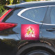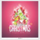 Ein Vinyl-Aufkleber mit einem hellen und festlichen Weihnachtsgrafik-Design. Der Text sagt frohe Weihnachten und Glück im neuen Jahr. Entworfen mit einem baumförmigen Hügel mit festlichen Schneeflocken, Sternen, Weihnachtsbaumbläsern und glänzend aussehenden Glitzern. Auch die Kiefernnadeln und die baumförmige Abbildung sind in diesem Urlaubsbild enthalten. Der Hintergrund ist eine lebendige rötlich-rosa Farbe.