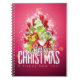 Ein Notebook mit einem hellen und festlichen Weihnachtsgrafik-Design. Der Text sagt frohe Weihnachten und Glück im neuen Jahr. Entworfen mit einem baumförmigen Hügel mit festlichen Schneeflocken, Sternen, Weihnachtsbaumbläsern und glänzend aussehenden Glitzern. Auch die Kiefernnadeln und die baumförmige Abbildung sind in diesem Urlaubsbild enthalten. Der Hintergrund ist eine lebendige rötlich-rosa Farbe.