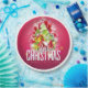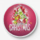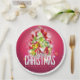 Papier Teller mit einem hellen und festlichen Weihnachtsgrafik-Design. Der Text sagt frohe Weihnachten und Glück im neuen Jahr. Entworfen mit einem baumförmigen Hügel mit festlichen Schneeflocken, Sternen, Weihnachtsbaumbläsern und glänzend aussehenden Glitzern. Der Hintergrund ist eine lebendige rötlich-rosa Farbe.