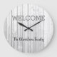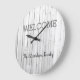 Moderne rustikale Begrüßung Familienname, weißer grauer Schiffshintergrund, Wanduhr. Sie können den Text einfach ändern und Ihren Namen hinzufügen.