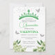 Eine moderne Salbei-grüne Blumenschmetterlinge Quinceañera Einladungskarte mit silberem Glitzer verbindet Eleganz und Eleganz. Der weiche, grüne Hintergrund ist mit feinen Blumenarrangements und flatternden Schmetterlingen geschmückt und schafft eine traumhafte und naturlich inspirierte Ästhetik. Silver Glitzer Akzente fügen eine Touch von Funkeln hinzu und verstärken das königliche und feierliche Gefühl des Designs. Eine Silhouette im Stile einer Prinzessin oder eine luxuriöse Typografie in Silberschimmern vervollständigen das Aussehen und machen es zu einem stilvollen und bezaubernden Quinceañera-Fest.