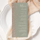 Die links Seite dieses eleganten, modernen Hochzeitsmenüs besticht durch das Design eines Glitzer in Rose mit vergoldeten Imitaten. Der individuell anpassbare Text kombiniert Creme Handschrift, Copperplate und kursiv Schriftart auf einem gesalzgrünen Hintergrund. Auf der Rückseite ist ein passendes schlinggrün-goldenes Glitzer-Design mit Rose.