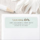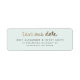 Ein modernes, elegantes Save the Date Rücksendeetikett mit lässigem rettetest unseres Datums-Drehbuchs in Gold auf einem Aquahintergrund. Koordiniert mit unseren modernen Gold Blatt Ankündigung Datum freihalten Karten.