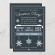 Jährliche WeihnachtsParty Einladung mit einem modernen Gefühl. Schatten von Blauem und von Weiß mit Schneeflocken, Schneestapel und Fahnenband auf Front.