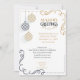 Weihnachts-Party Einladung | Moderne Schwarz-Gold-Minimal-Weihnachtsbaummöbel - Schwarz-Gold-gestreifte Weihnachtsschmuck auf unterschiedlichen Ebenen - gepaart mit Goldene-Ecke-Scrollen und zeitgenössischem Schriftart ' Jahresgrüße ' machen dies attraktiv für Zuhause- oder Geschäftsreisen - und passen sich mit Ihren Informationen einfach an - dies ist Teil der modernen Schwarz-Gold-Minimal Holiday Baubles Collection