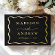 Fügen Sie Ihrer Hochzeitsfeier eine personalisierte, skurrile Touch mit dem Gästebuch des modernen Black and Gold Foil Wavy Frame Fotos hinzu! Das Design zeigt die Namen des Paares und das Hochzeitdatum in Folienschrift, umgeben von einem gewellten Rahmen mit schwarzem Hintergrund. Fügen Sie Ihren eigenen Text in den Rücken der Folie Hochzeitstorch. Auf der Rückseite des Retro-Gästebuches wird Ihr horizontales Foto angezeigt.