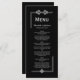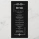 Ein modernes, schwarzes Hochzeitsmenü mit einem stilvollen silbernen Imitat Glitzer-Rahmen und Skripttext.