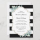 Moderne Schwarz-Weiß Hochzeitskarte mit Eukalyptus-Blätter auf schwarz-weiß gestreiftem Hintergrund. Matching-Elemente verfügbar.