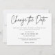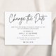 Maßgeschneiderte Hochzeitsaufschiebung/Ändern der Datumskarte mit modernem Schwarz-Weiß-Schriftzeichen auf der Vorderseite, farbiger Hintergrund auf der Rückseite.