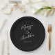 Diese modernen personalisierten Hochzeitspapier-Teller sind mit den Vornamen der Braut und des Bräutigams und dem Hochzeitstag in handgeschriebener Schrift-Typografie auf einem einfachen schwarzen Hintergrund versehen. Karo in unserem I Liebe Weddingz Shop um mehr zu erfahren. Entworfen von Susan Coffey.