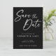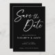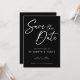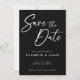 Modernes Schwarz mit weißen handgeschriebenen Stil Hochzeit Speichern Sie das Datum Einladungskarte. Dieses Design verfügt über einen großen kalligraphischen Schriftart, den Sie ändern können. Sie können auch alle Details und Farben auf diesem Save the Date Design anpassen.