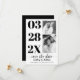Moderne Schwarz-Weiß zwei Foto Ankündigung Datum freihalten. Es zeigt das Datum in schwarzer Typografie in einer Spalte und zwei Fotos des Paares. Der Satz "Save the Date" ist in Schriftzeichen-Schrift. Die Rückseite ist schwarz.