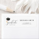 Einfache und moderne Script-Abschluss kehradressieren Etikett mit einer eleganten Typografie und eine Abbildung einer schwarzen Graduierungshülse. Illustriert und entworfen von Patricia Alvarez.