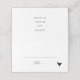 Dieses moderne Drehhähnchenmenü mit gefalteter Platzkarte eignet sich perfekt für einen minimalistischen Hochzeitsempfang. Das schlichte Schwarz-Weiß-Design zeichnet sich durch eine einzigartige, industrielle Schrift-Typografie mit modernem Boho-Stil und einem Hühnersymbol aus. Nutzen Sie diese Platzkarten, um sicherzustellen, dass Ihre Gäste am Empfang die richtige Mahlzeit erhalten. Personalisieren Sie die Rückseite der Platzkarten mit den Namen der Braut und Bräutigam und dem Datum. Kaufen in loser Schüttung und Handschrift schreiben Sie die Namen und Tischnummern der Gäste auf den gedruckten Karten, wenn sie ankommen.