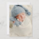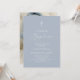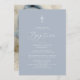 Eine einfache, moderne Taufpause mit einer dustigen blauen Karte mit weißer Typografie, um Ihre Schlüsseldetails wie den Namen, das Datum, die Uhrzeit und den Ort der Taufe, den Empfang und die UAWG zu personalisieren. Auf der Rückseite befindet sich ein Foto Ihres Babys