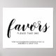 Moderne Script Gastgeschenke Hochzeiten Zeichen mit Titel in schwarz modernem Script Schriftart mit Details in schwarz modernen Sans Serif Schriftart auf weißem Hintergrund.