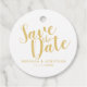 Modernes Script Gold Wedding Save the Date Favor Tags enthält Titel in modernen goldenen Skript-Schriftart mit Namen und Datum in modernen serifenlosen Schriftart auf weißem Hintergrund. Bitte beachten Sie: Die Details der Folie werden im Kunstwerk simuliert. Bei der Herstellung dieses Produktes wird keine Folie verwendet.