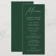 Entspannen Sie bei einem Hochzeitsempfang mit unserem wunderschön gestalteten Hochzeitsmenü, das ein schlankes, handgeschriebenes weißes Skript auf einem Jägergrün enthält. Dieses moderne Design ist perfekt für Paare, die ein schlichtes und dennoch raffiniertes Aussehen suchen. Es lasse Ihnen, sich mit Ihren Namen, Ihrem Hochzeitstag und dem Menü-Angebot persönlich zu fühlen. Sein minimalistischer Stil ergänzt mühelos jedes Hochzeitsthema und sorgt für eine Touch Eleganz. Lassen Sie sich von einem Menü beeindrucken, das die schicke Einfachheit Ihrer Hochzeitsvision widerspiegelt.
