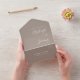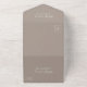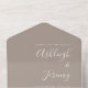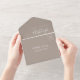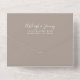 Diese schlichte, moderne Hochzeitseinladung besticht durch weißen Text auf einem taupe Hintergrund. Fügen Sie die Namen der Braut und Bräutigam in stilvoller Handschrift Kalligraphie und die Details in sans serif Schriftart. Die abnehmbare UAWG enthält Text auf weißem Hintergrund. Fügen Sie Ihre Rücksendeadresse in Weiß auf der Taupe Außenklappe und Rückseite der UAWG.
