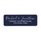 Fügen Sie Ihrer Hochzeit eine persönliche Touch mit dem modernen Script nautical marine blue Hochzeitsrücksenlabel hinzu. Dieses Adressetikett zeigt den Namen von Braut und Bräutigam in einem modernen, weißen Script-Schriftart mit der Adresse in weißem, modernen Sans Serif Schriftart auf marineblau Hintergrund. Ideal für Hochzeiten im Wassersport und vieles mehr.