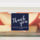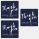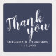 Moderne Script Navy Blue Gastgeschenk Hochzeit Vielen Dank Labels mit dem Titel "Danke" in weißem, modernem Script Schriftart mit Namen und Datum in modernen Sans Serif Schriftart auf marineblau Hintergrund.