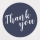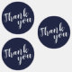 Moderne Script Navy Blue Gastgeschenk Hochzeit Danke Labels mit dem Titel "Danke" in weiß modernen Drehbuch-Schriftart auf marineblau Hintergrund.